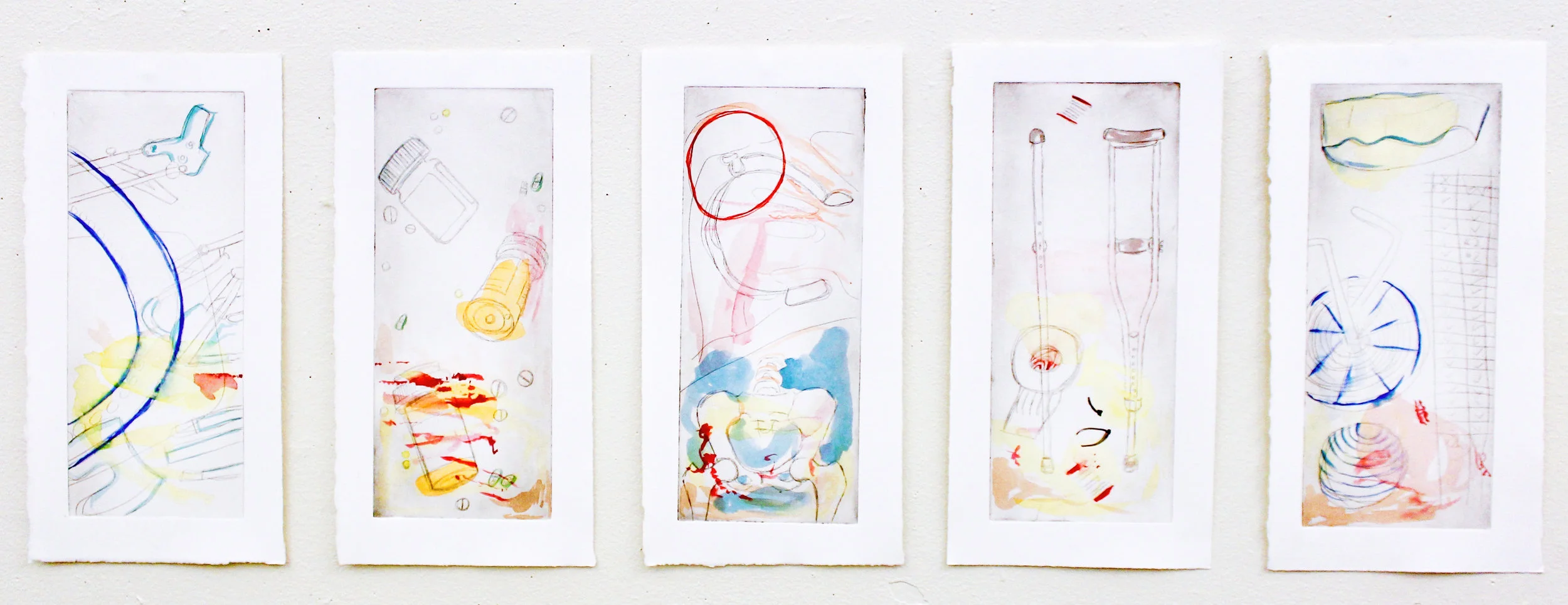 Hip Surgery 5.30, 2017, each work 12” x 14”, etching and watercolor on paper