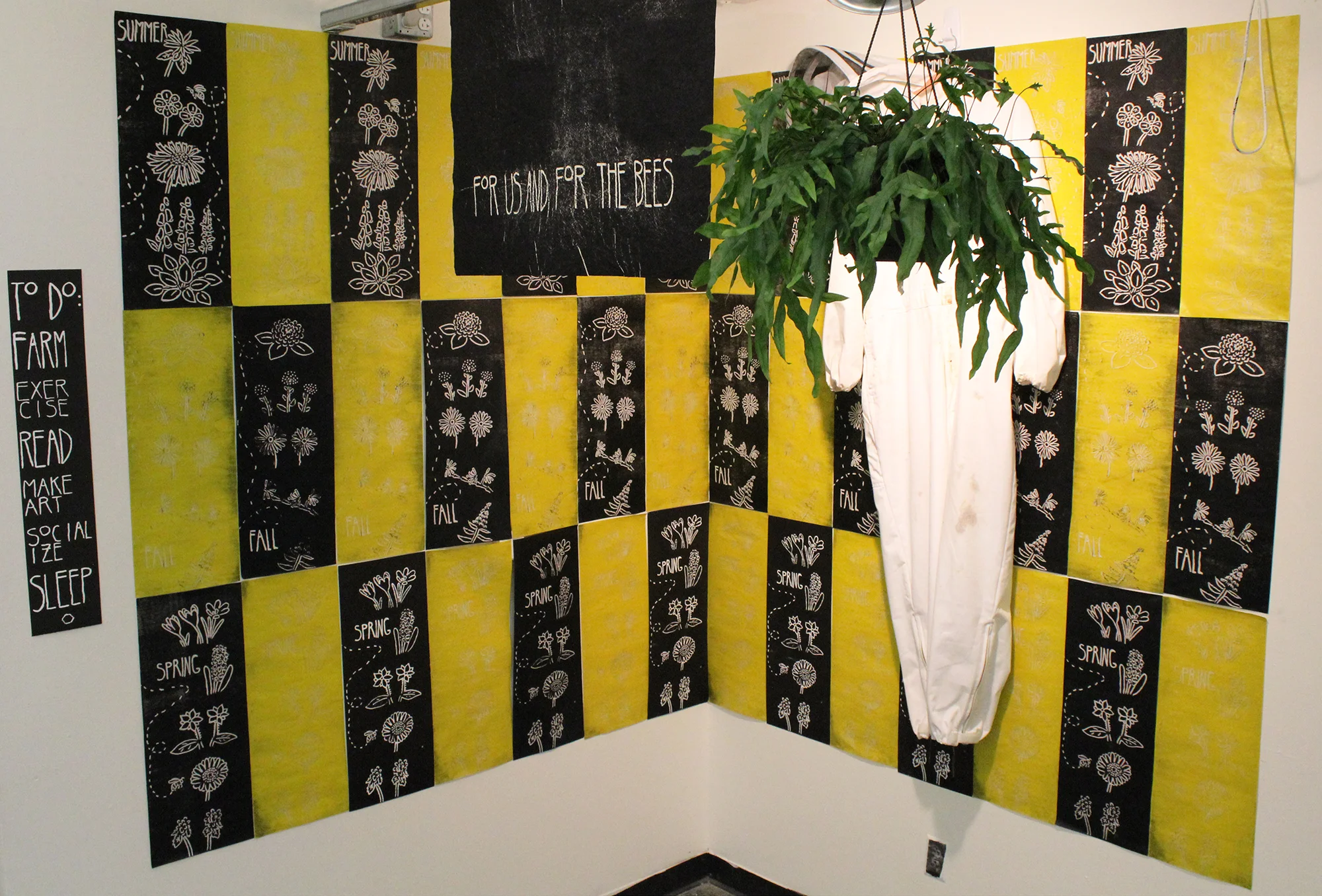For Us and For the Bees, 2016, size variable, woodcuts, live plant, bee suit