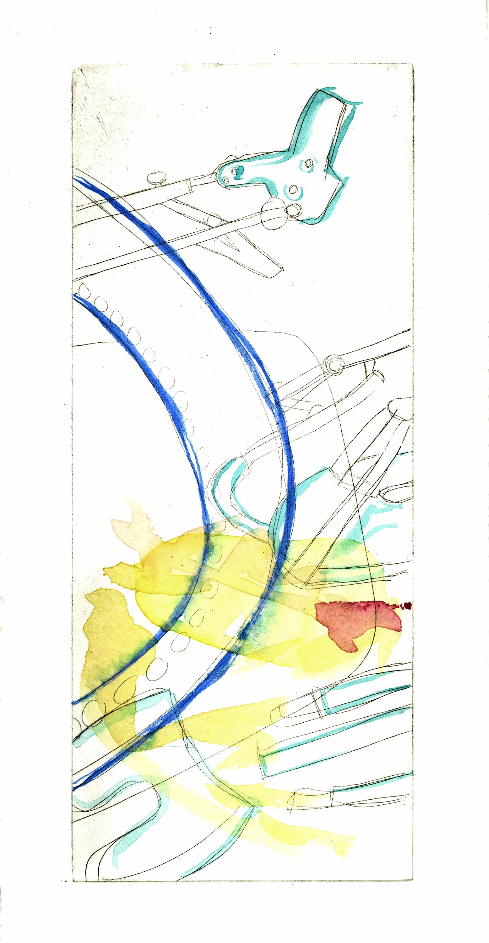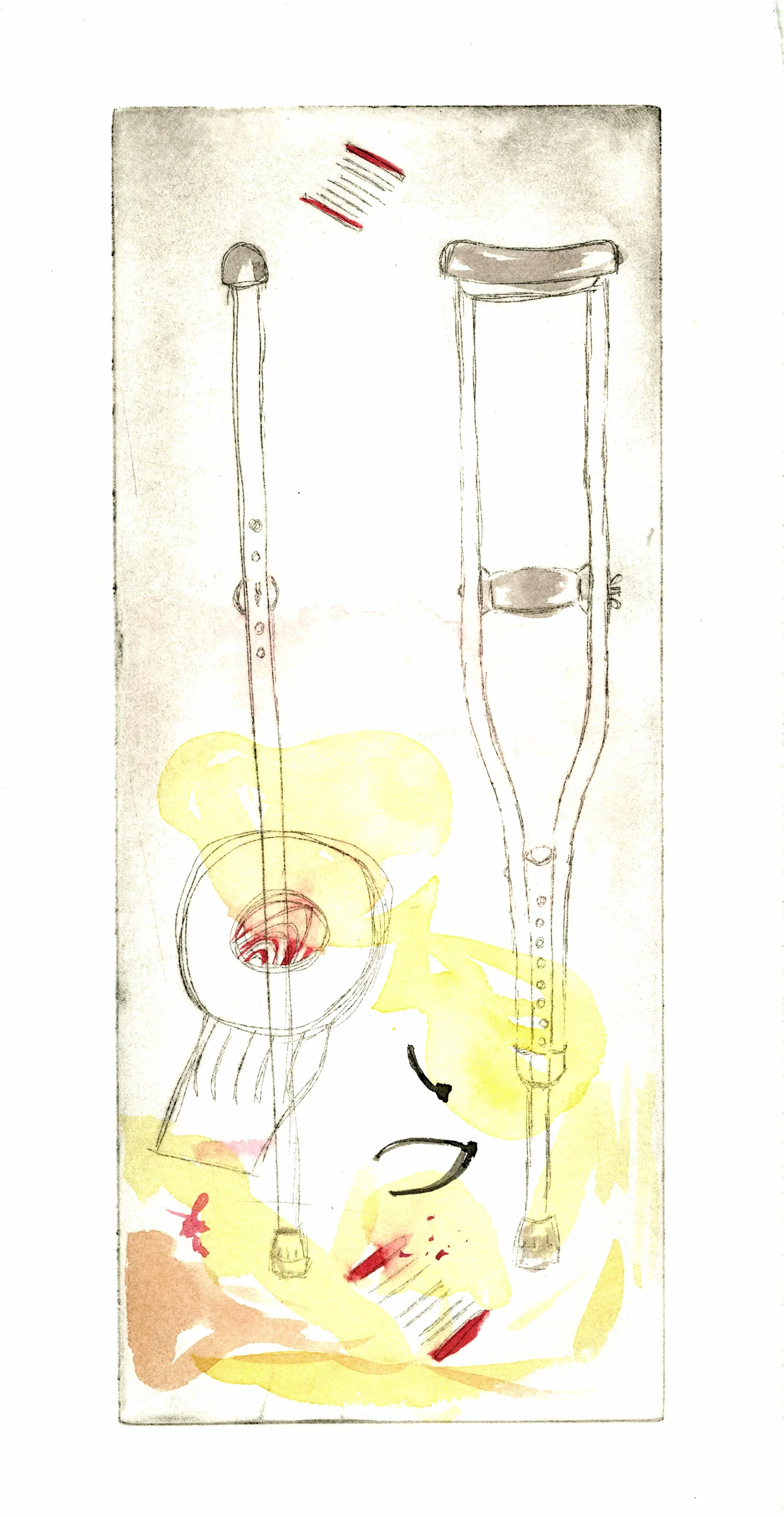 Hip Surgery 5.30d (Crutches & Brace), 2017, 12” x 14”, etching and watercolor on paper
